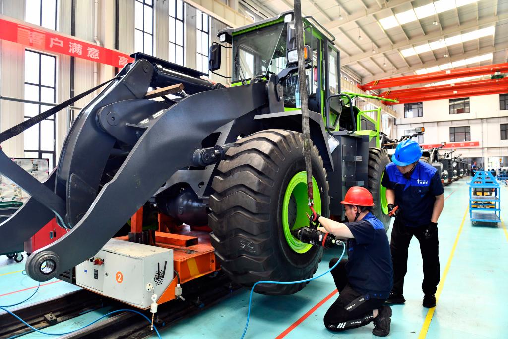 在枣庄市山亭区新能源汽车装备制造园,工作人员在生产电动装载机。新华社记者郭绪雷 摄