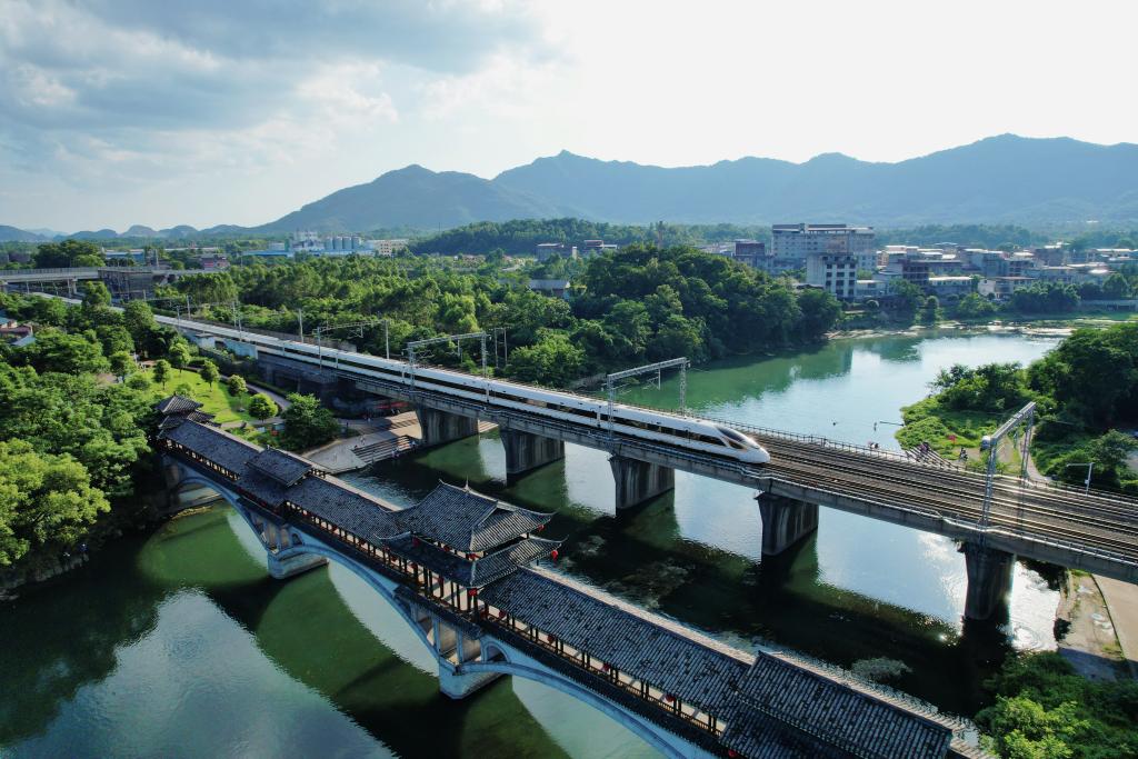 复兴号列车行驶在贵广高铁桂林灵川境内。(杨靖育 摄)