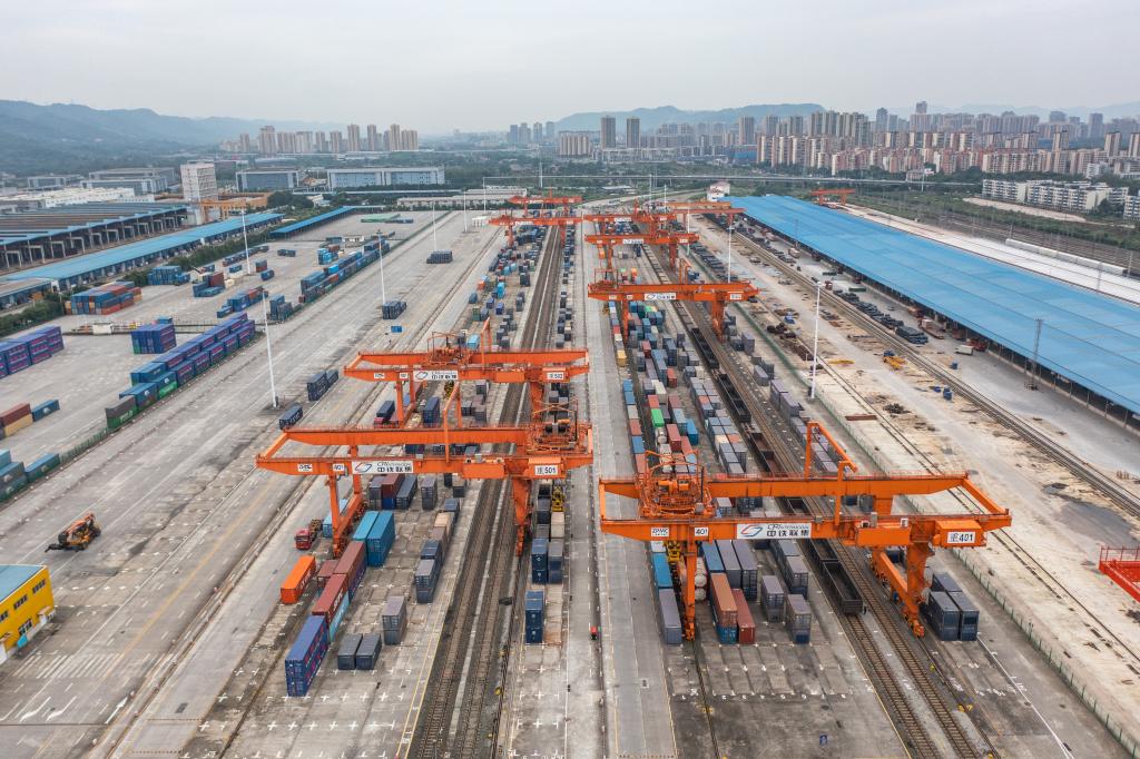 10月11日,一列西部陆海新通道班列从重庆团结村中心站驶出(无人机照片)。新华社记者黄伟 摄