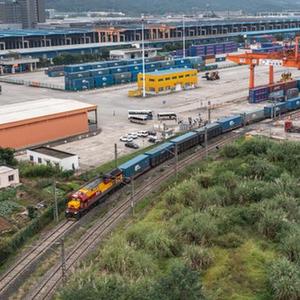 “呜——”10月11日下午5时左右,汽笛声在团结村中心站再次响起。一列装载重质纯碱、汽油机等货物的西部陆海新通道铁海联运班列缓缓驶出,将经广西钦州港运至多个国家和地区。