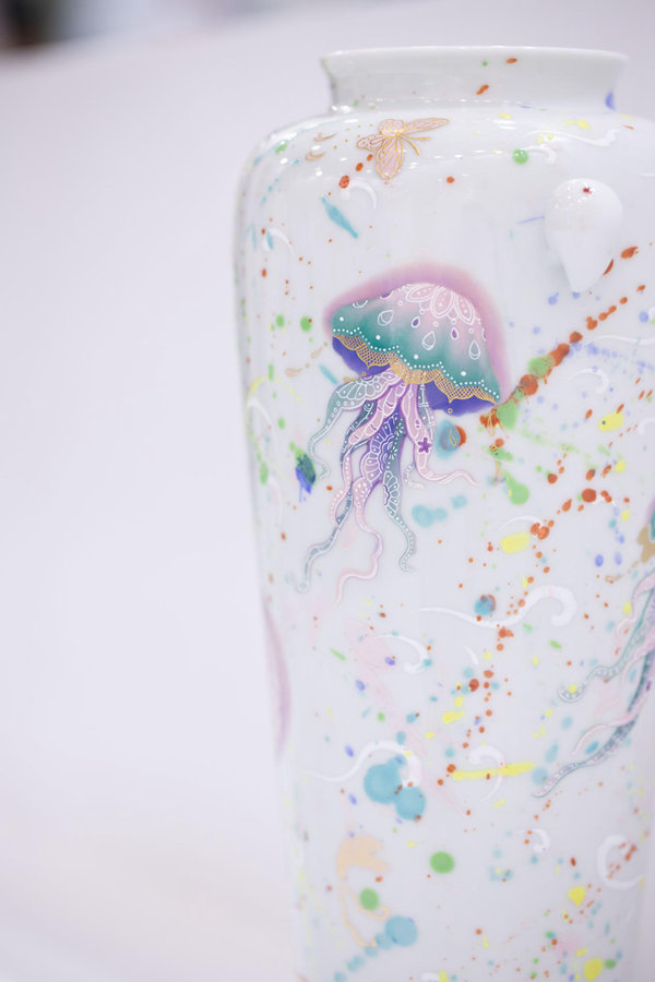 “这个工艺不仅解决了传统粉彩不能做到的多颜色立体叠加的问题,更加强了颜色搭配后的立体效果,是技术上的一次新突破。”余寅说。