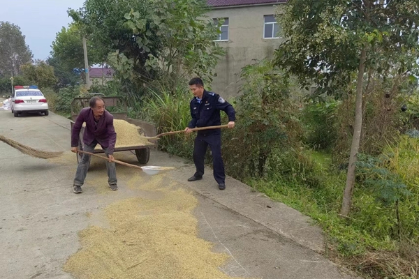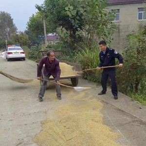 秋收季节到来,许多农民在路边晒起了稻子,10月13日下午,翁墩派出所民警辅警正在辖区郑楼村开展常态化巡逻防控时,突然下起了雨。所长王强发现了两位老人正在抢收晾晒的稻谷,因年龄较高,家中无子女帮忙,只剩老两口手忙脚乱。