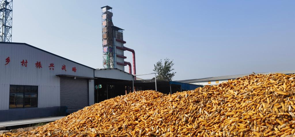 山东省嘉祥县农家人玉米种植专业合作社院内堆放着新一季玉米。(新华社记者叶婧 摄)