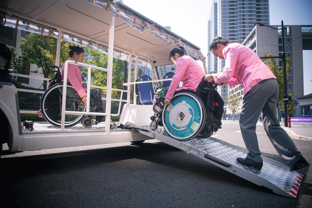 10月16日,中国体育代表团成员在杭州亚残运村内乘坐无障碍接驳车出行。新华社记者江汉 摄