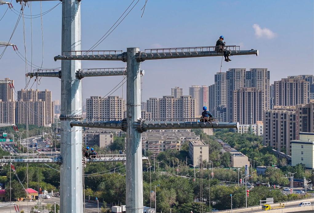 乌鲁木齐一处电力施工现场,工人正在铁塔上架设导线。(刘元宝 摄)