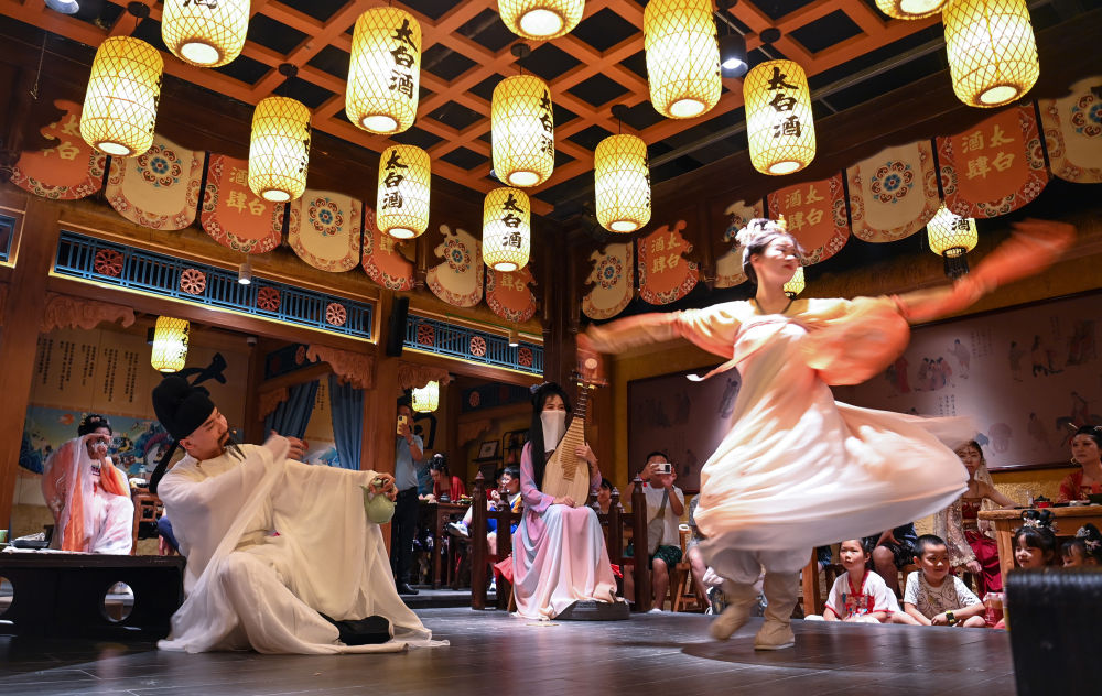 游客在长安十二时辰主题街区观看唐风演艺《将进酒》(2023年8月2日摄)。新华社记者 邹竞一 摄