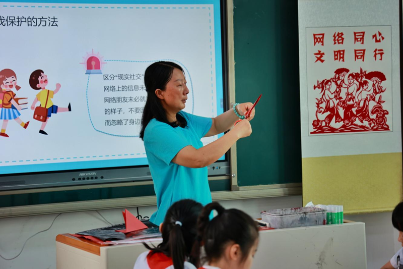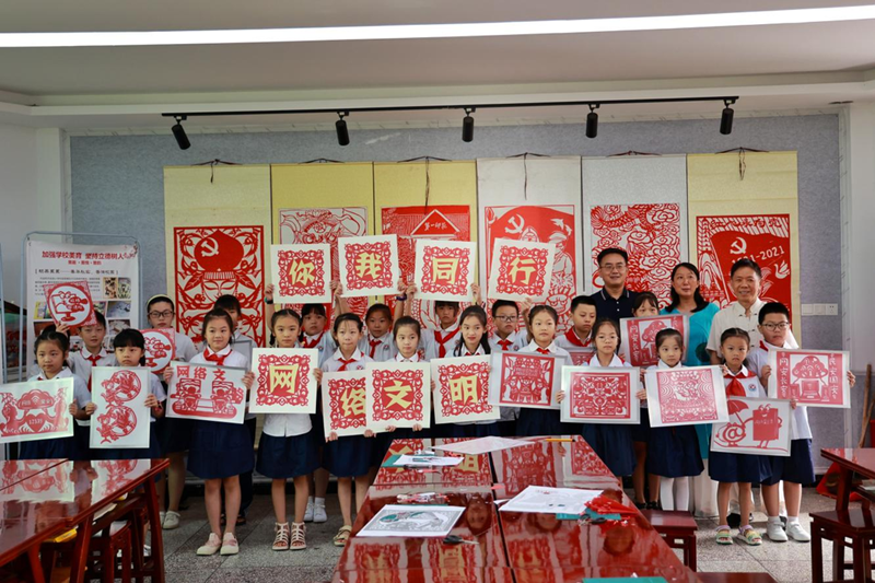 这是资阳区“网络文明进校园,网信开启e守护”的一次新探索。为让孩子们在寓教于乐的氛围中学习到网络文明知识,中共益阳市资阳区委网信办特邀益阳市非物质文化遗产套色剪纸传承人、剪纸艺术家贺春华与益阳市实验小学美术老师、剪纸爱好者肖静,带领20余名同学围绕文明上网、信息保护、数字素养等内容,用一把把普通的剪刀、一张张轻薄的红纸,转眼间创作出栩栩如生、精美别致的非遗剪纸作品50余幅。