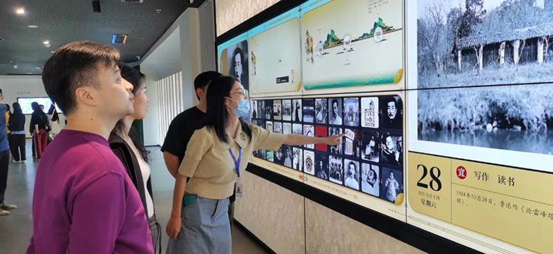 在这个数字展项中,文学日历是每日更新、每日不同。例如今日是10月28日,鲁迅曾于1924年10月28日写下《论雷峰塔的倒掉》,这篇文章后来被收录入语文教科书,成为家喻户晓的名篇。本展项就是围绕鲁迅,展示其朋友圈、人生时间轴、照片及故事。随着日期的变化,内容都会因时而异,所以游客可能每次过来都会看到不一样的内容。