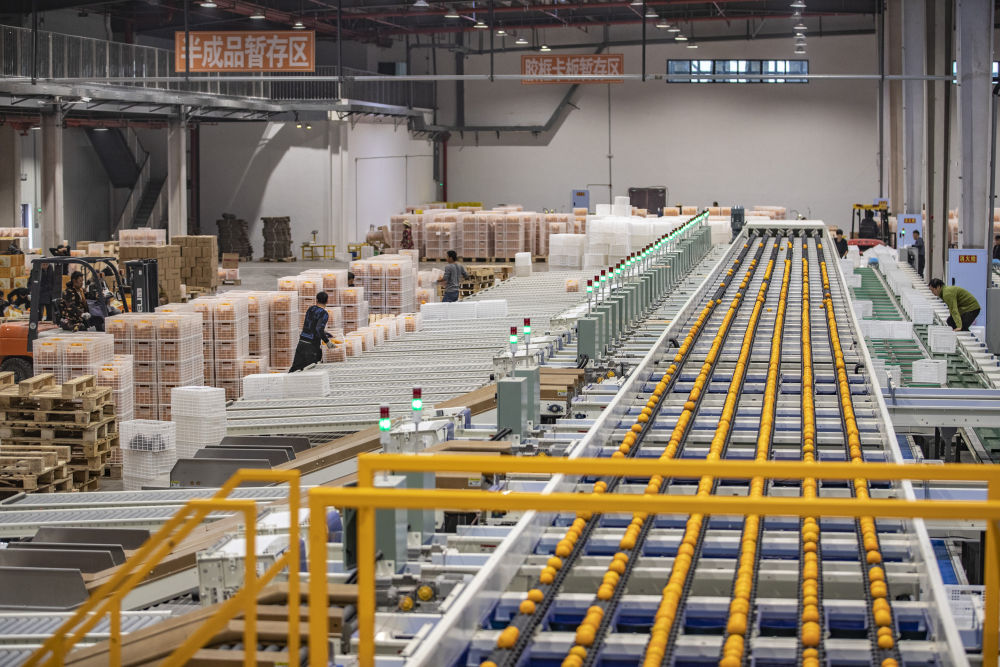2023年1月6日,在中国三峡柑橘(奉节脐橙)交易中心,全自动分拣线将脐橙自动分拣装筐。新华社记者 黄伟 摄