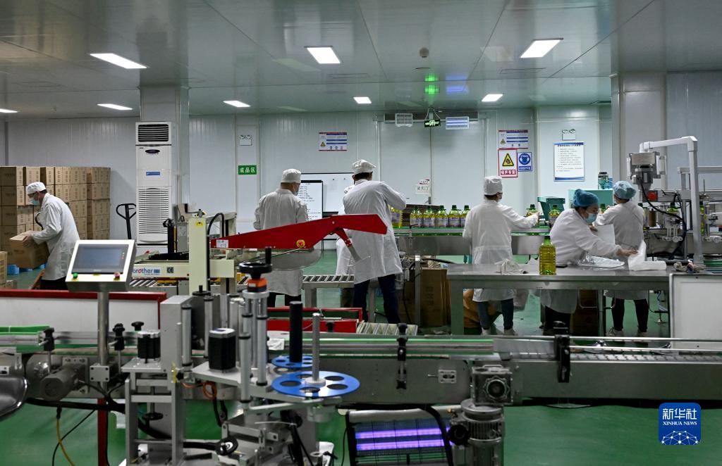 11月4日,在阿拉山口综合保税区内的阿拉山口金牧生物科技有限公司,工作人员在包装亚麻籽油。新华社记者 赵晨捷 摄