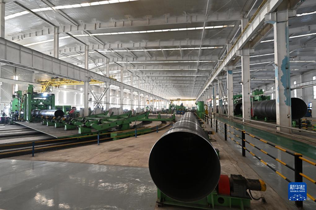 这是阿拉山口新博油气管道制造有限责任公司的生产车间(11月4日摄)。该公司主营高端焊管的生产、保温、防腐等业务。新华社记者 李鑫 摄