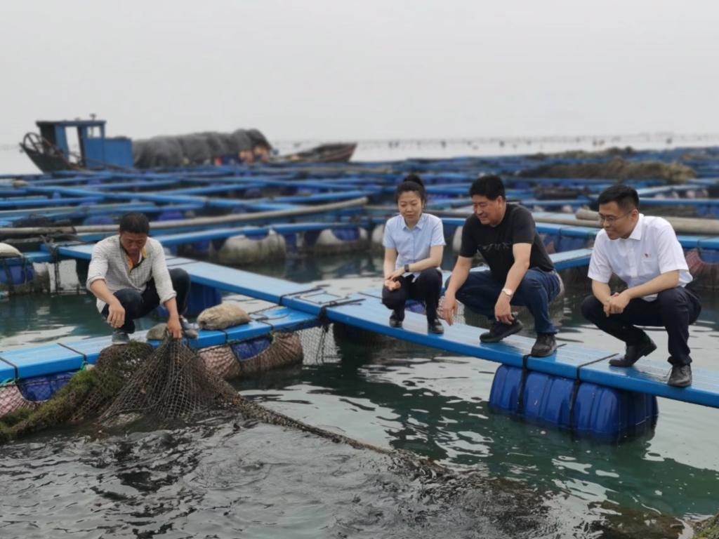 银行工作人员在渔排上了解企业养殖情况。新华社记者秦宏 摄