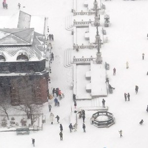 11月6日,游客在哈尔滨建筑艺术馆外游览(无人机照片)。当日下午,黑龙江省气象台继续发布暴雪红色预警信号。新华社发(刘洋 摄)
