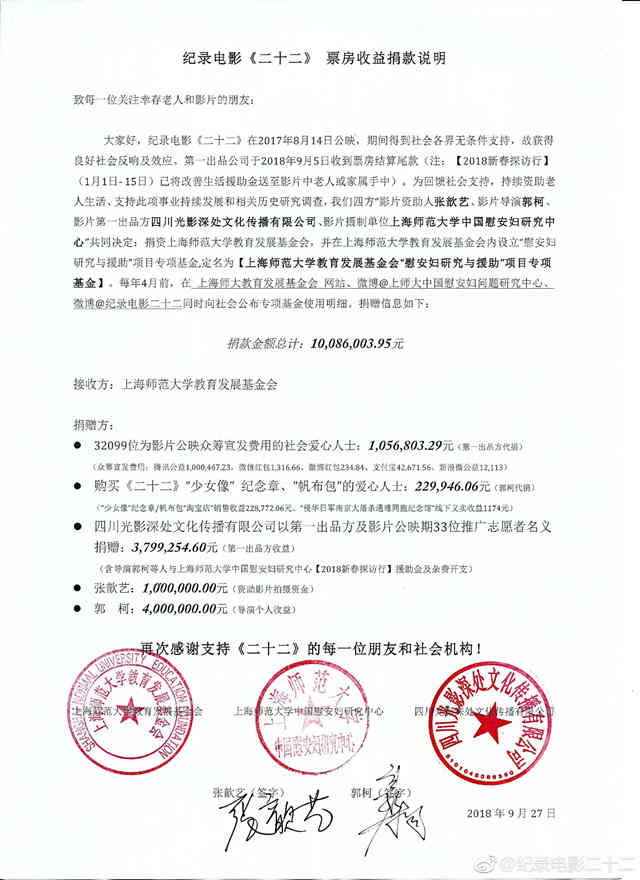 最终,《二十二》上映6天票房即破亿元,成为内地首部票房破亿的纪录片。记录历史、留下证据、唤醒记忆、传递善意……电影上映一年后,导演郭柯履行诺言将自己的400万元个人收益全部捐出,再加上多方人士的爱心捐款,共同向上海师范大学教育发展基金会捐资10086003.95元,用于设立“慰安妇研究与援助”专项基金。