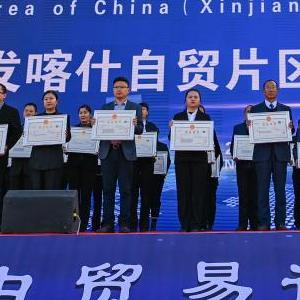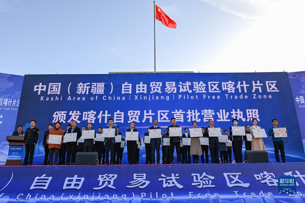 11月11日,在中国(新疆)自由贸易试验区喀什片区揭牌仪式现场,首批入驻自贸片区的经营主体获颁营业执照。新华社记者 丁磊 摄