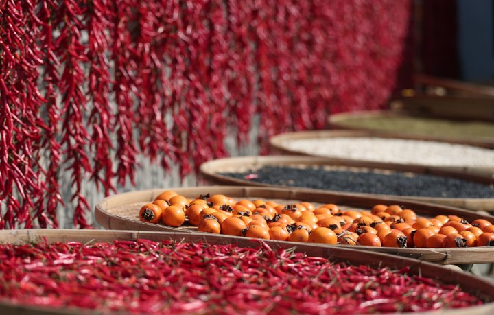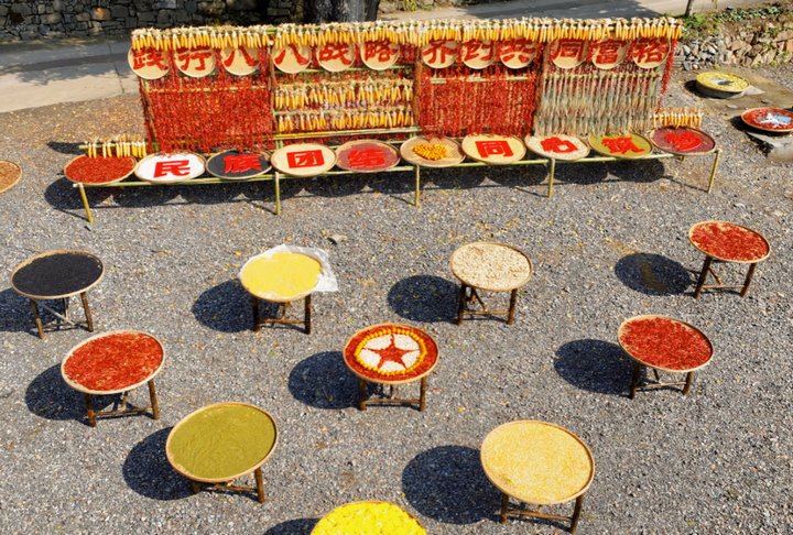 晒秋,就是把秋天丰收的瓜果蔬菜晾晒在太阳底下,里面有的红、有的绿、有的黄,五颜六色煞是好看,每年,万市镇槎源坞村都有晒秋的习俗。