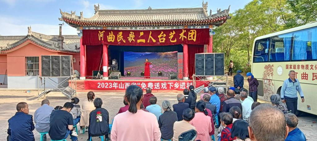 河曲二人台是融民歌、舞蹈、戏曲等为一体的地方戏,在当地有广泛的群众基础。常常人往那儿一站,手持道具,几个板凳,就组成了一个临时的舞台。