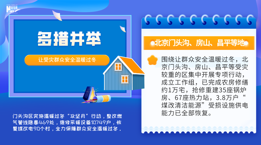 围绕让群众安全温暖过冬,北京门头沟、房山、昌平等受灾较重的区集中开展专项行动,成立工作组,已完成农房修缮约1万宅,抢修重建35座锅炉房、67座热力站,3.8万户“煤改清洁能源”受损设施供电能力已全部恢复。