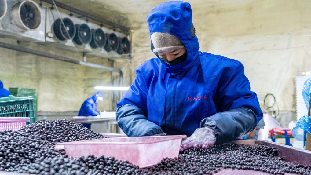 吉林省靖宇县大北山村的冷库内,工作人员正在遴选蓝莓。新华社发(唐成卓摄)