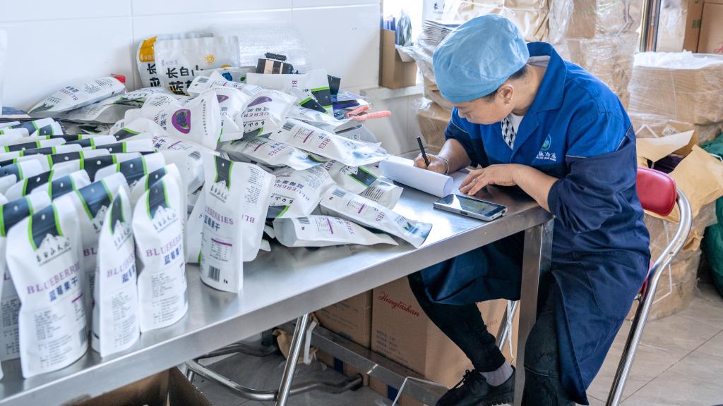 吉林省靖宇县大北山村的园区内,一名工作人员正在登记蓝莓果干订单信息,准备发货。新华社发(唐成卓摄)