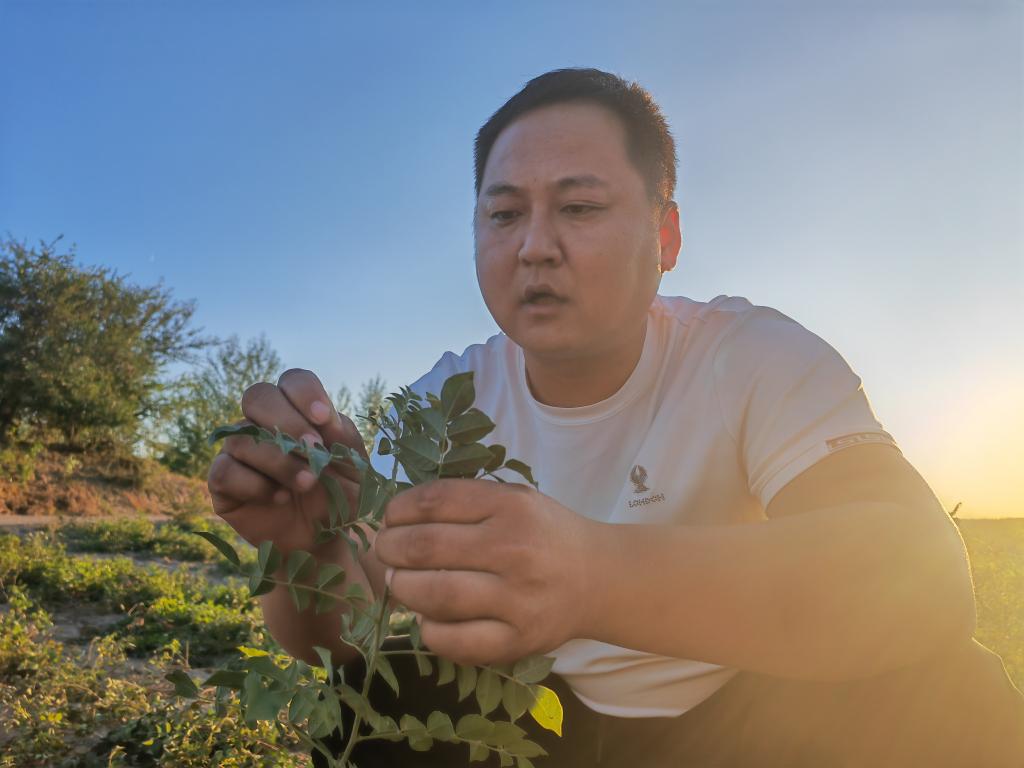 复兴村村党支部书记孙宏良展示村集体经济中药甘草 。(新华社记者李双溪摄)