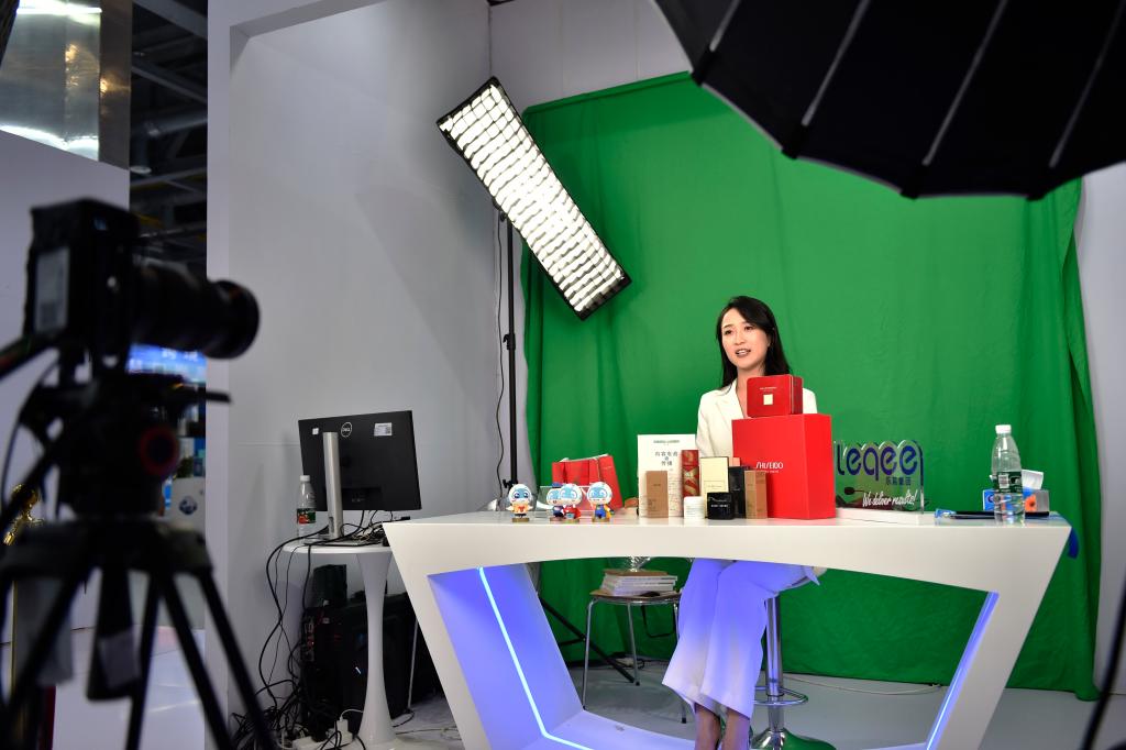11月23日,在第二届全球数字贸易博览会丝路电商馆,一名主播进行电商直播。新华社记者 刘岭逸 摄