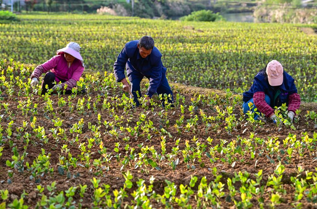 11月7日,在重庆市酉阳县龙潭镇柏香村的油茶苗圃基地,村民正在移栽油茶苗。(冉川 摄)