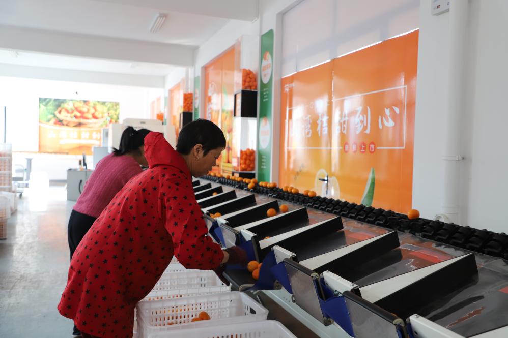 一旁,不同大小、糖度的柑橘通过自动化智能分拣机进入不同果筐。共富工坊负责人林进友望着今年新购置的设备,算了一笔效率账:“以前一个人纯人工分拣50筐共2000多斤柑橘,需要8个多小时。现在有了数字化技术助力,这些柑橘1小时就能分拣完,品质检测也更加精确,便于分级处理、分批销售,提高山湾桔品牌影响力。”