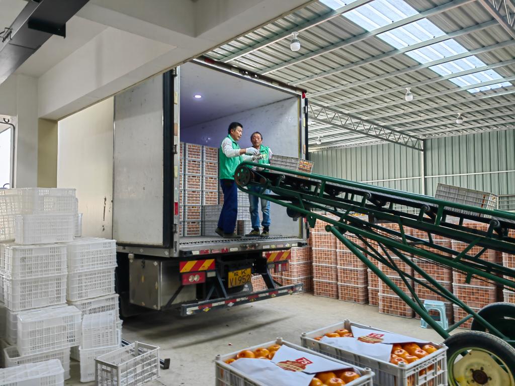 三门县浦坝港镇鲜甜共富工坊内,工人们将一箱箱柑橘搬运到集装箱车上。新华社记者袁野 摄