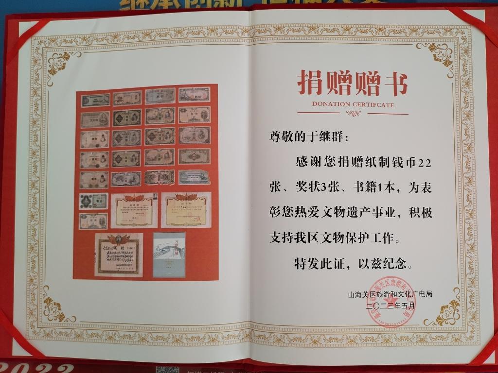 今年国际博物馆日,山海关区旅游和文化广电局举办山海关中国长城博物馆第二批文物藏品捐赠仪式,市民于继群一家三代人收到捐赠证书,父亲于骞举捐赠青花瓷碗、竹木直角尺、铁渔刀,于继群和爱人捐赠纪念章、钱币等,儿子于亦凡捐赠书籍和文献资料,三代人共为博物馆捐赠了62件藏品。