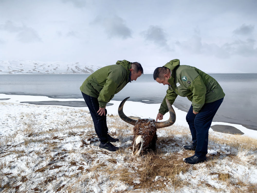2023年10月16日,巡护员在新疆阿尔金山国家级自然保护区内查看死亡野牦牛的头骨。新华社记者 李响 摄