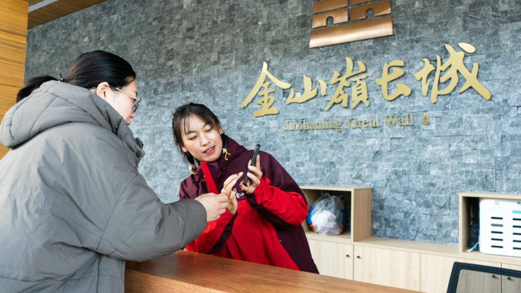 金山岭长城文物保护中心工作人员在帮助游客使用“云长城·河北”数字云平台,欣赏金山岭长城美景。(梁志青 摄)