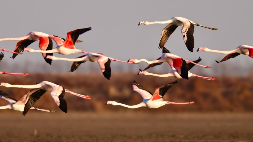 大红鹳从条子泥湿地上空飞过。(李东明 摄)