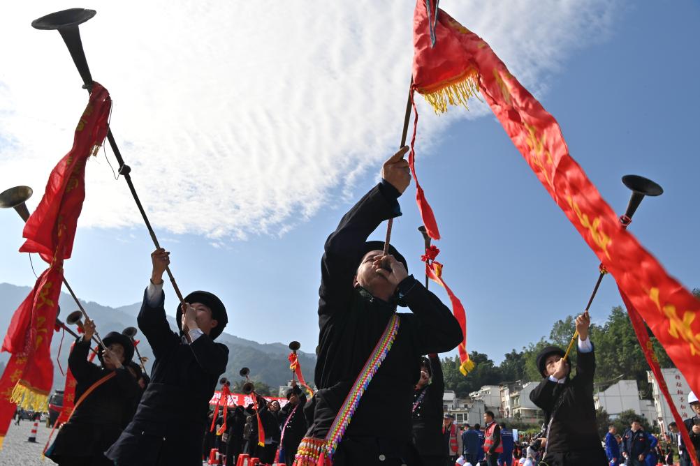 瑶族群众在黄桶至百色铁路建设动员大会上吹响瑶族长号。新华社记者周华 摄