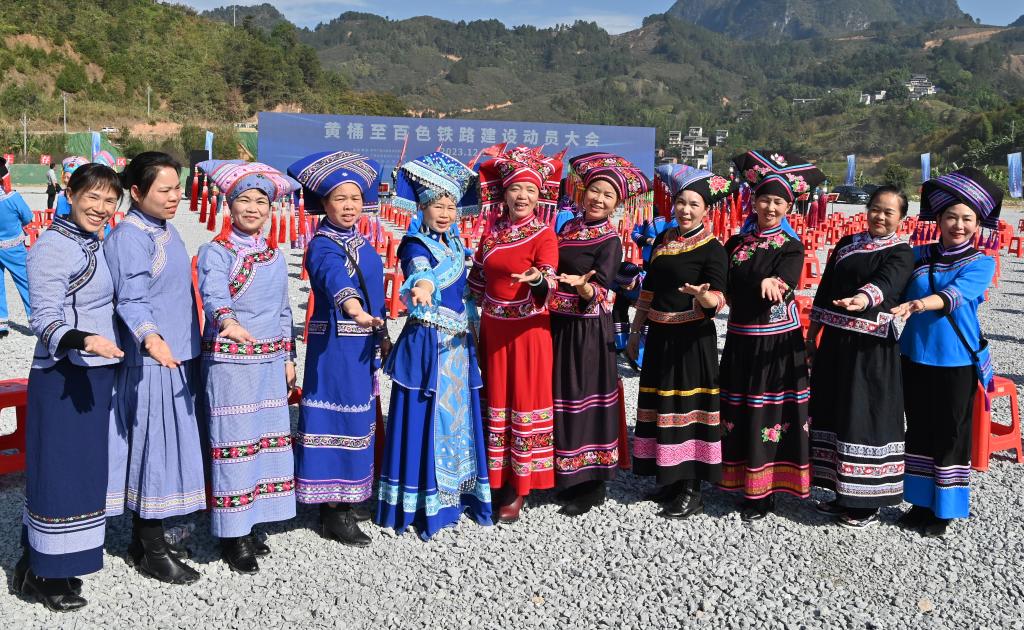 参加黄桶至百色铁路建设动员大会的各族群众合影。新华社记者周华 摄