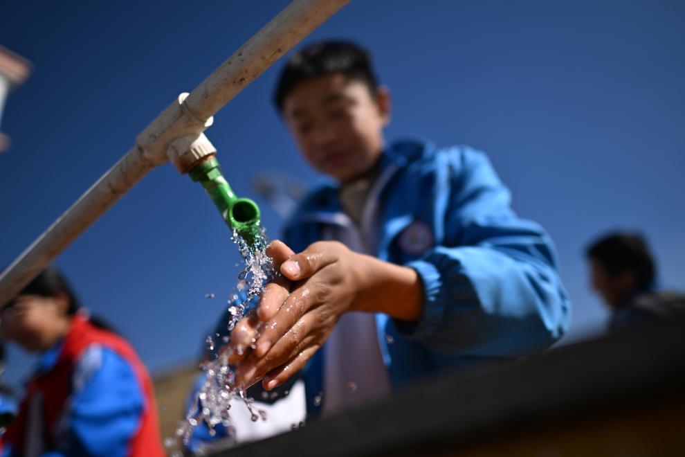 在青海省果洛藏族自治州玛多县花石峡镇藏文中心寄宿制学校,五年级学生东桑(右一)在使用厕所后洗手,该学校是环境卫生特别项目学校之一(11月2日摄)。新华社记者 张宏祥 摄