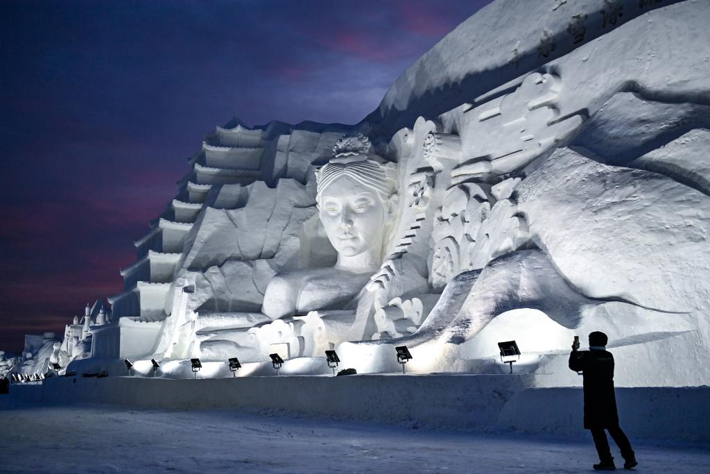 12月12日,游客在长春冰雪新天地的一处雪雕拍照。新华社记者 颜麟蕴 摄
