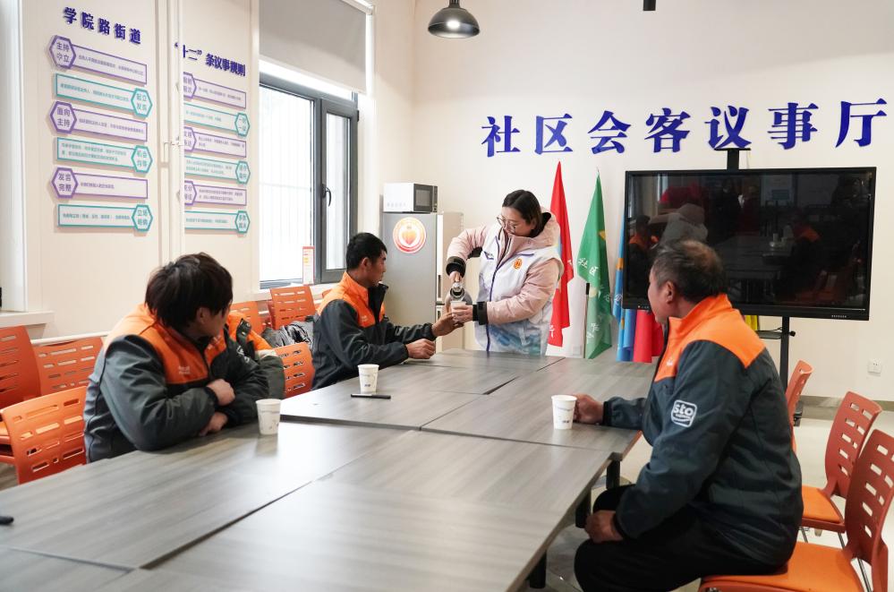 12月13日,在北京海淀区学院路街道二里庄社区服务中心暖心驿站,工作人员为快递员倒水。新华社记者 任超 摄