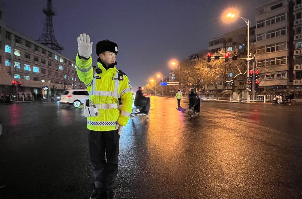 “大哥慢点儿骑,雪天路滑,注意安全!”进入晚高峰,在天津市南开区红旗路与西湖道交叉口,天津市公安交通管理局南开支队红旗路大队交警邵伯淳正在提示一位外卖小哥注意安全。为应对强降雪,邵伯淳和其他几名同事提前到岗,分工协作,不停地在路口疏导往来车辆行人,维持交通秩序。