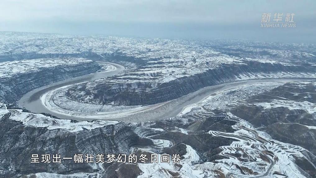 各种形状的流凌玲珑晶莹,漂浮在宽阔的黄河水面上,沿着河道蜿蜒漂流,极目远眺宛如一条白色丝带,与乾坤湾美景交相呼应,呈现出一幅壮美梦幻的冬日画卷。
