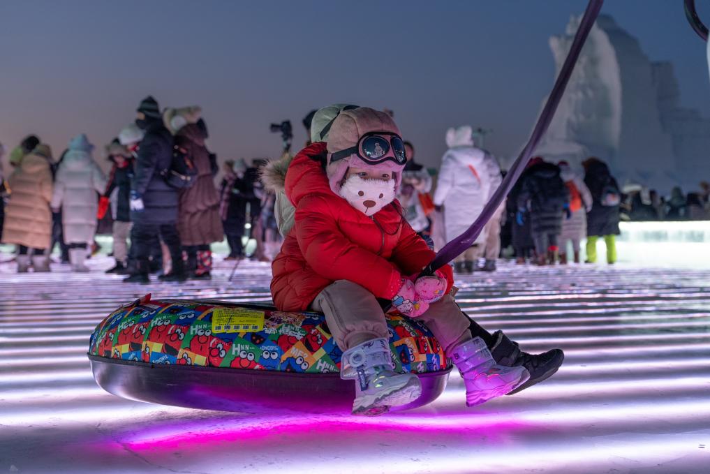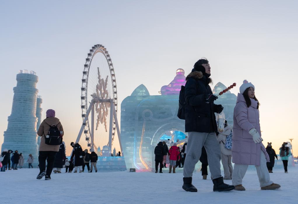 12月18日,游客在哈尔滨冰雪大世界园区游玩。