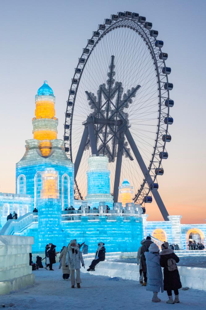 12月18日,游客在哈尔滨冰雪大世界园区内的“雪花摩天轮”附近游玩。