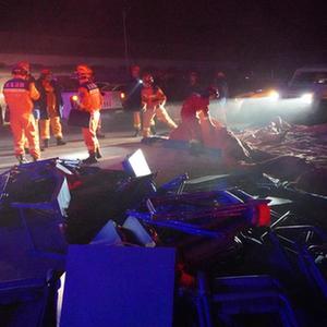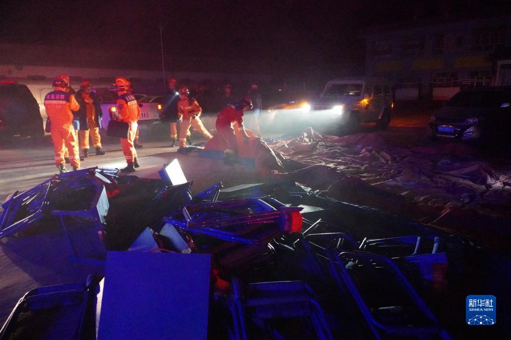 12月19日凌晨,在甘肃省临夏回族自治州积石山保安族东乡族撒拉族自治县大河家镇陈家村,救援力量在现场整顿物资开展救援。新华社记者 马希平 摄