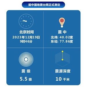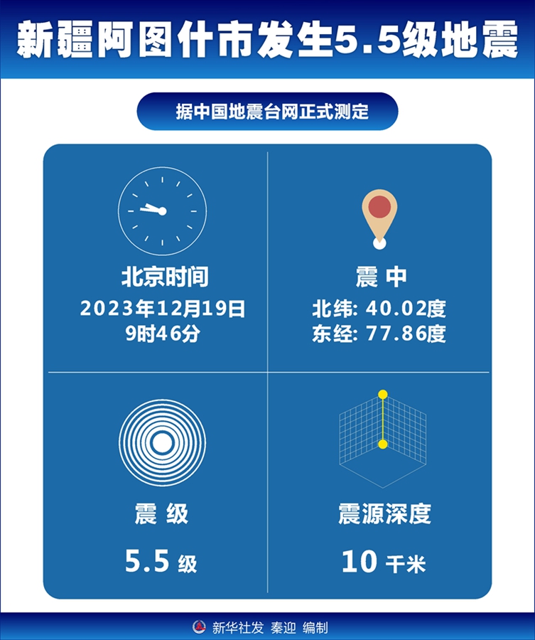 新华社快讯:中国地震台网正式测定:12月19日9时46分,在新疆克孜勒苏州阿图什市(北纬40.02度,东经77.86度)发生5.5级地震,震源深度10公里。