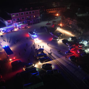 12月19日,在甘肃省临夏回族自治州积石山保安族东乡族撒拉族自治县大河家镇大河村,多方力量开展救援(无人机照片)。新华社记者 张睿 摄