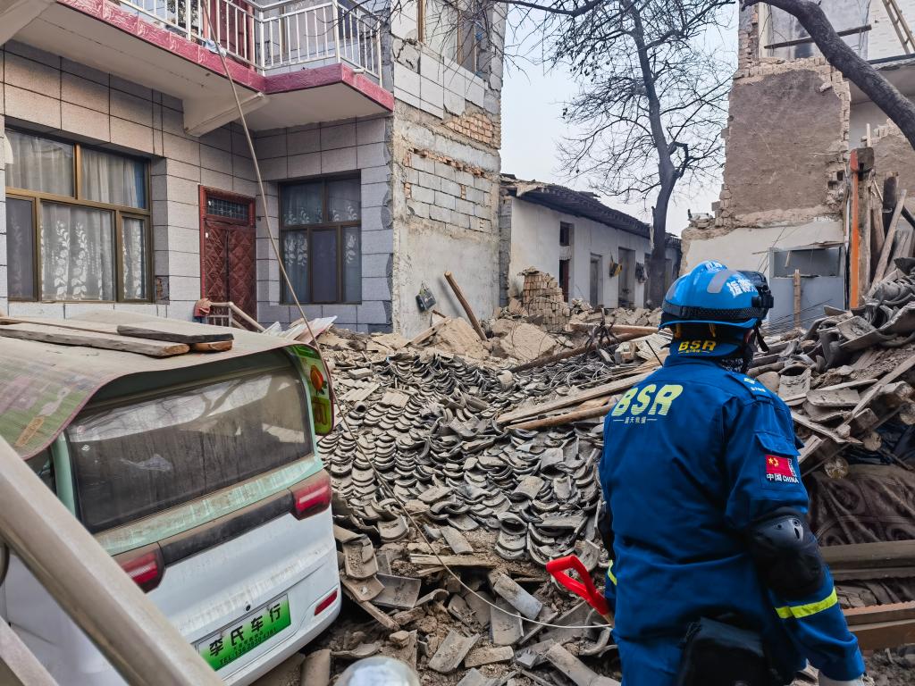 救援队员正在一处倒塌的房屋前探查情况。新华社记者 胡伟杰 摄