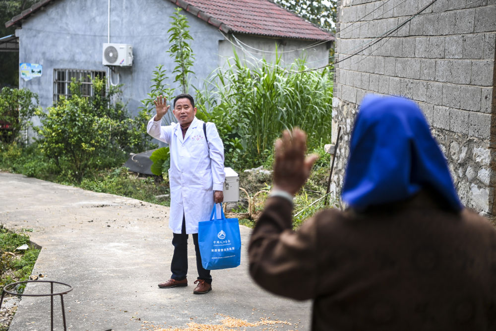 广西贵港市港北区大圩镇中西村,村医黄增亮(左)出诊结束后与村民挥手告别(11月29日摄)。