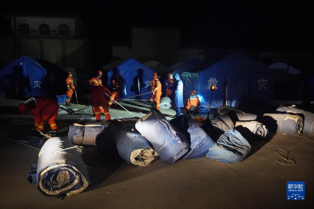 图为12月19日,在甘肃省临夏回族自治州积石山保安族东乡族撒拉族自治县大河家镇大河村,消防人员搭建救灾帐篷。新华社记者 马希平 摄