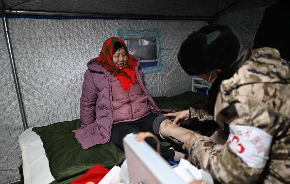 12月19日,在民和县中川乡美一小学的集中安置点,一名受灾民众在安置点帐篷内接受理疗。新华社记者 张宏祥 摄