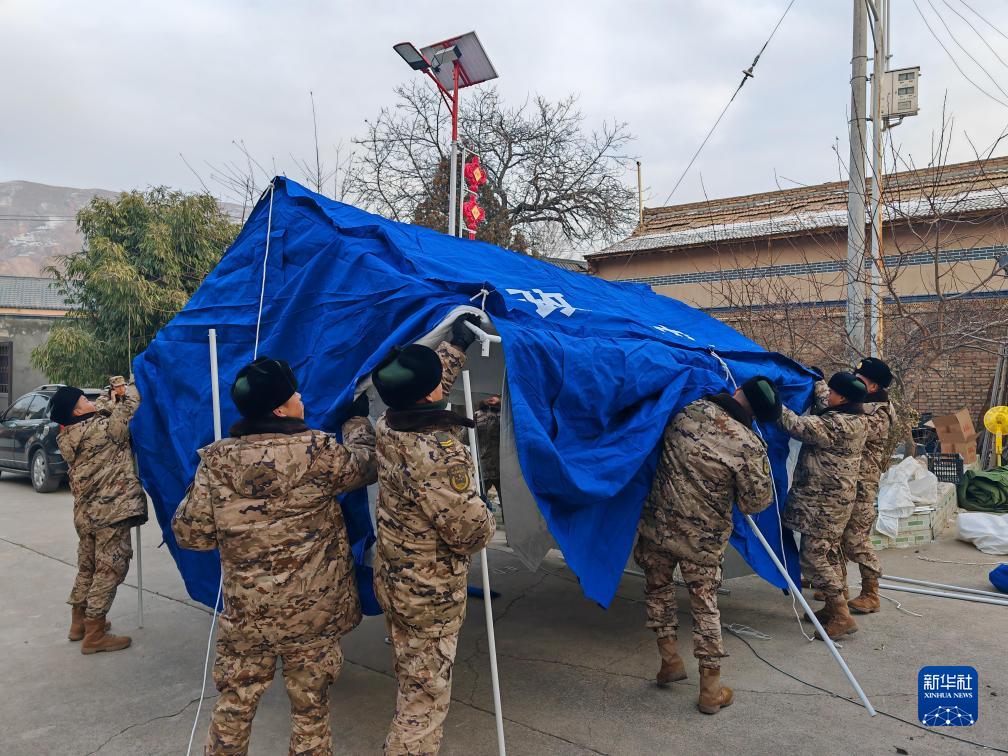 12月20日,武警甘肃总队临夏支队官兵在积石山县刘集乡高李村搭建帐篷。